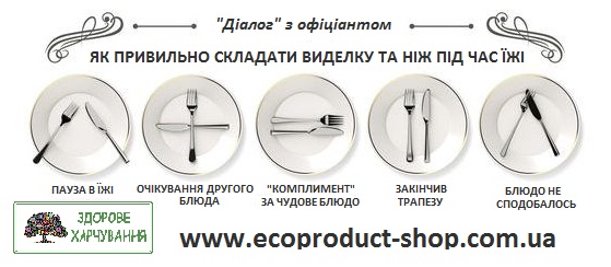 Але! Для того, що б офіціант подав наступне блюдо, йому потрібно забрати у Вас тарілку після попереднього страви. Якщо в тарілці залишилася частина їжі або Ви вийшли зі столу «припудрити носик» (перекурити), офіціант повинен розуміти - Ви вже закінчили з цією стравою або просто зробили паузу?