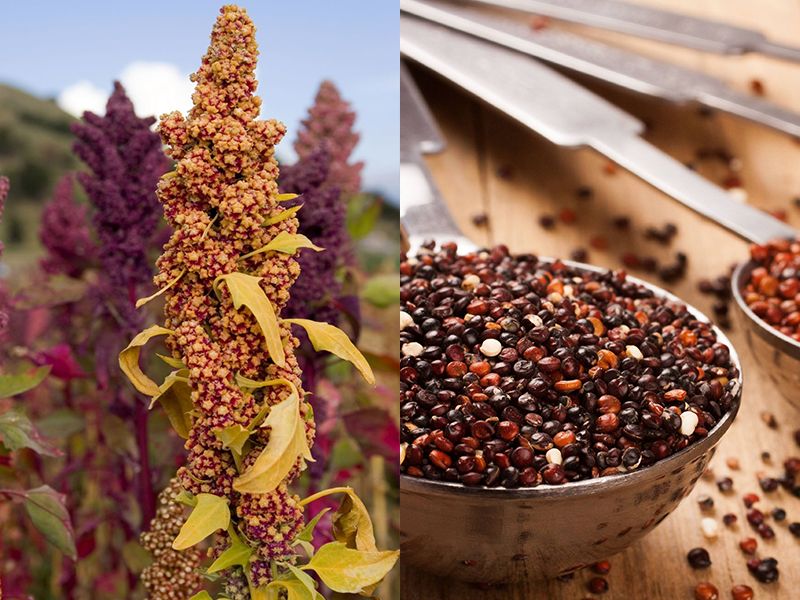 Кіноа швидко стала модним Суперфудом, але мало хто бачив, як вона росте. Псевдокрупа, зібрана в грона, дозріває на таких ось кольорових стеблах. Зібраний урожай вчені називають фруктами, оскільки киноа відноситься до псевдозернових культур.