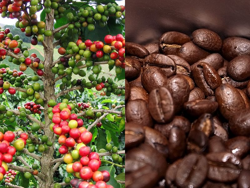 Кава являє собою невеликі дерева або великі чагарники, всі частини яких містять кофеїн, що відлякує шкідників. Як і у випадку з какао, напій виходить з насіння, укладених в плодах. За певну зовнішню схожість їх називають «кавовими вишнями».