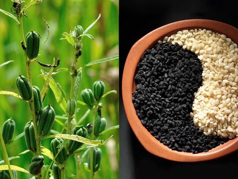 Кунжутні зерна «зберігаються» в подовжених коробочках, які кріпляться до стебла, що досягає до 2 метрів у висоту. Якщо коробочка перезріває, вона вибухає як хлопавка, розкидаючи вміст по окрузі.