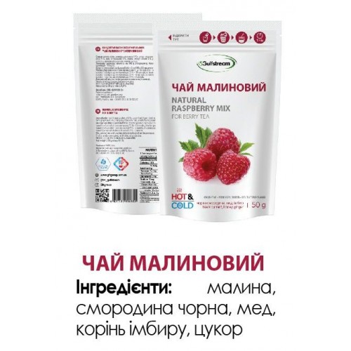 Малина свіжа швидкозаморожена 39%, цукор, смородина чорна свіжа швидкозаморожена 9%, мед натуральний 8%, корінь імбиру свіжий 5%, регулятор кислотності (кислота лимонна), ароматизатор ваніль, кориця мелена.