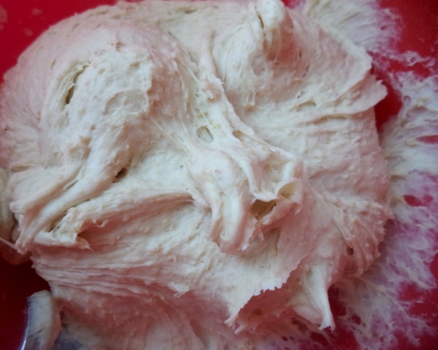Насипаємо сіль та частками додаємо просіяне борошно, перемішуючи. Перемішувати можна й ложкою, тісто тягнеться, липне. Але мені подобається перемішувати міксером – так легше, швидше і якісніше.