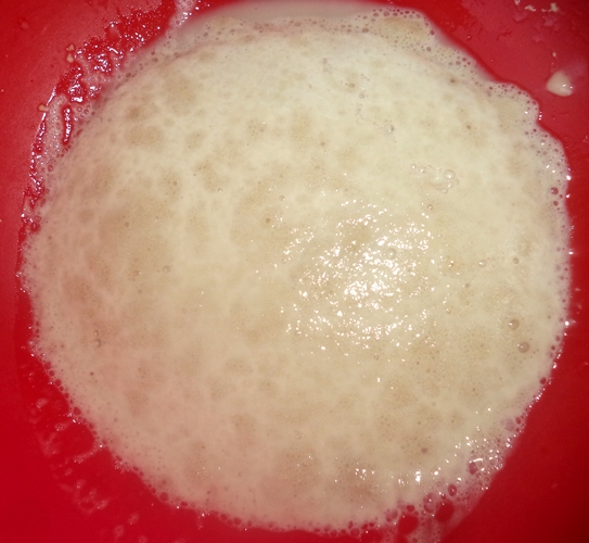 Розчинити у теплій воді дріжджі та цукор. Прикривши рушником, поставити у тепле місце хвилин на 10-15, доки не утвориться пінна «шапка».