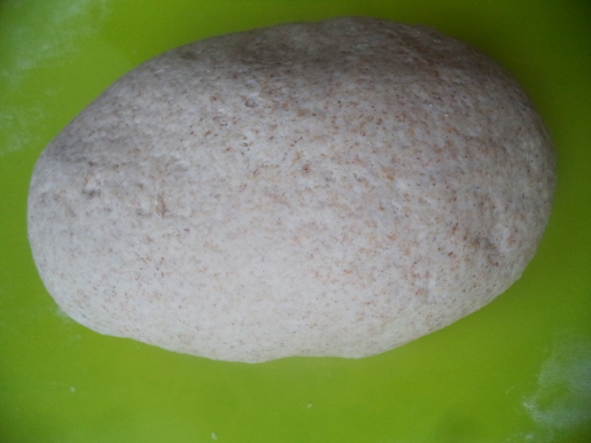 Змащуємо ком тіста 1 чайною ложкою олії і викладаємо у глибоку миску. Прикриваємо рушником і ставимо у тепле місце приблизно на 1,5 години, щоб тісто збільшилось вдвічі.
