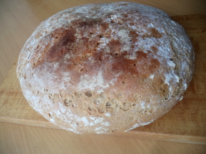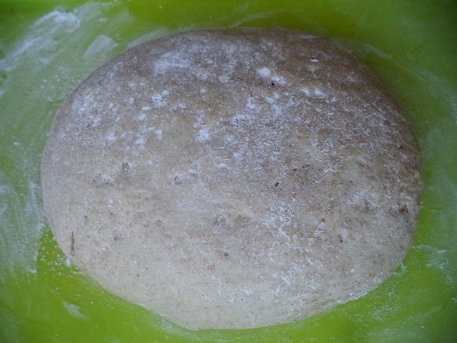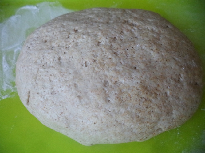 Потім тісто обережно обминаємо і формуємо круглу чи видовжену буханку. Присипаємо верх пшеничним борошном.