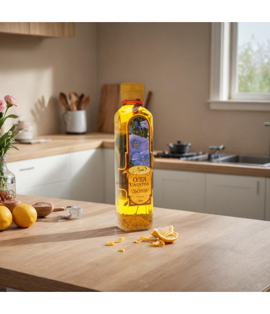 Салатна олія «Льонок», виготовлена з насіння льону – багата на поліненасичені жирні кислоти класу омега3, вітаміни А, Е захищає слизову шлунку, нормалізує роботу кишечнику, покращує обмін ліпідів (холестерину), сприяє відновленню діяльності серцево-судинної системи, нормалізує артеріальний тиск, захищає від стресів, підвищує працездатність. Олія отримана по низькотемпературній технології з екологічно чистої, генетично не модифікованої, сировини, з додаванням прянощів і спецій.