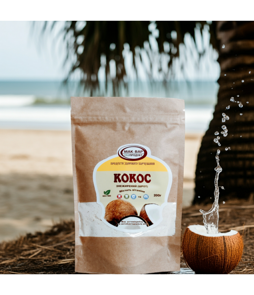 Знежирений кокосовий шрот — це натуральне джерело клітковини, лауринової кислоти, кальцію та вітамінів A, B, C. Продукт має легкий природний аромат кокоса та допомагає очищувати кишківник, підтримувати здорову мікрофлору та травлення. Лауринова кислота проявляє антимікробну дію та підтримує імунітет.