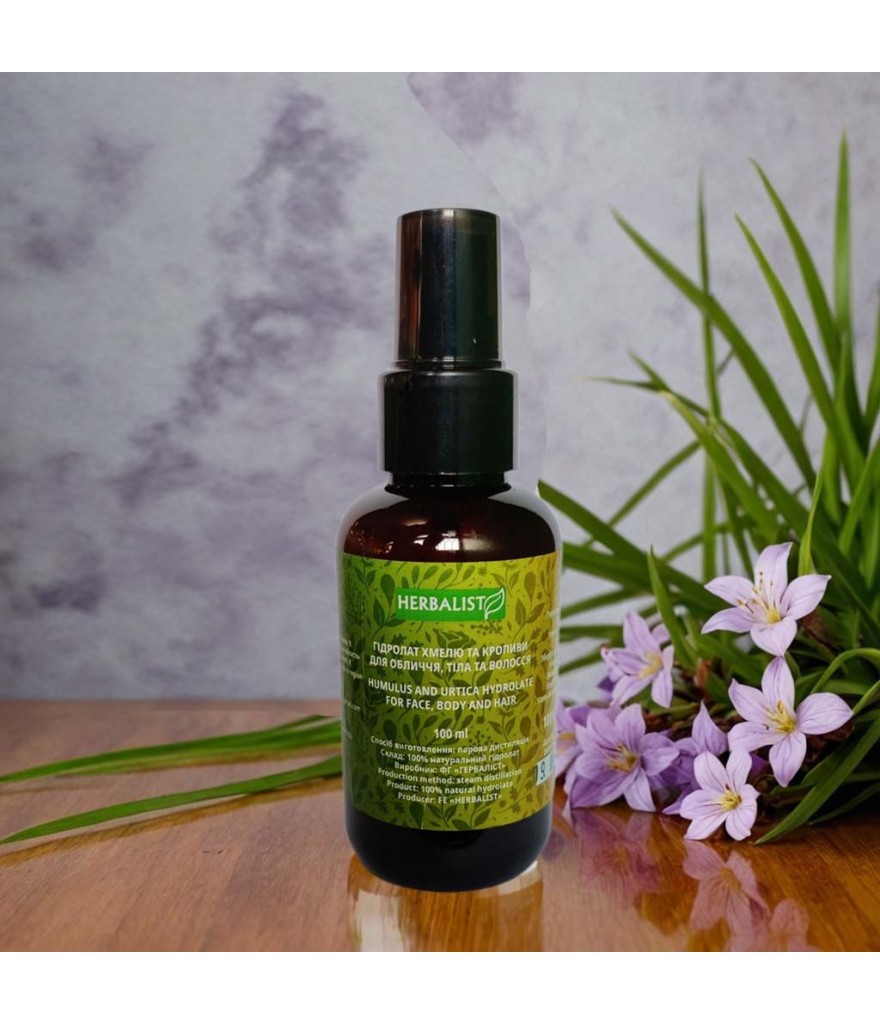 Склад: 100% натуральний гідролат шишок хмелю і листя кропиви дводомної